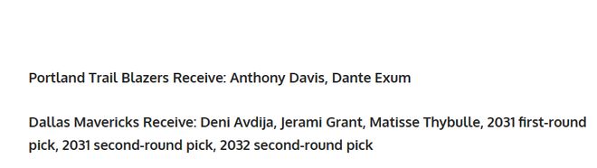 独行侠得到:德尼・阿夫迪亚、杰拉米・格兰特、马蒂斯・塞布尔、2031 年首轮签、2031 年次轮签、2032 年次轮签