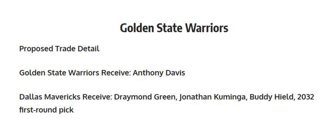 独行侠得到:德雷蒙德・格林、乔纳森・库明加、巴迪・希尔德、2032 年首轮签