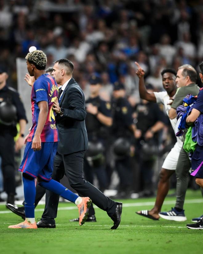 本赛季首场皇萨国家德比,最终以皇马在伯纳乌2-1击败巴萨而告终,但是赛后却起了冲突。根据《马卡报》和《每日体育报》的现场报道,这场赛后冲突并非偶然。比赛刚一结束,卡瓦哈尔径直走向亚马尔,表情严肃、语气强硬,显然是冲着人去的。“继续说啊,你不是很能说吗?”卡瓦哈尔用手做出挑衅的手势,据目击者描述,他当时的语气中带着明显的不满。几名皇马球员随即围上来,气氛骤然紧张。巴萨球员也立刻上前维护自家小将,现场几乎要演变成推搡。最终,裁判组与安保人员介入才让双方冷静下来。