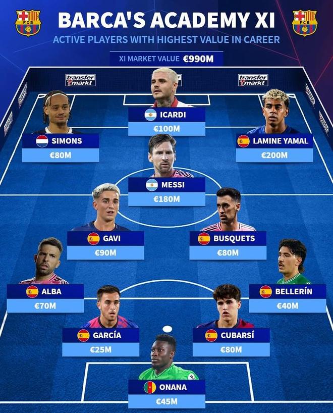北京时间10月29日,德转列出了巴塞罗那青训历史身价最高的11人阵容,亚马尔2亿欧元最高,梅西1.8亿欧元第二,伊卡尔迪1亿欧元第三,奥纳纳入选。